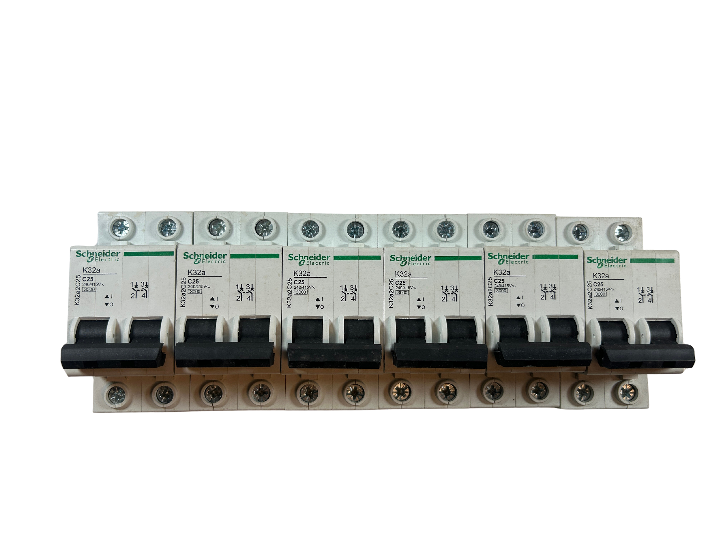6 pçs Disjuntor bipolar modelo K32a, corrente nominal 25A, 3kA, curva C, tensão de isolamento 240V K32A2C25 Schneider Eletric.