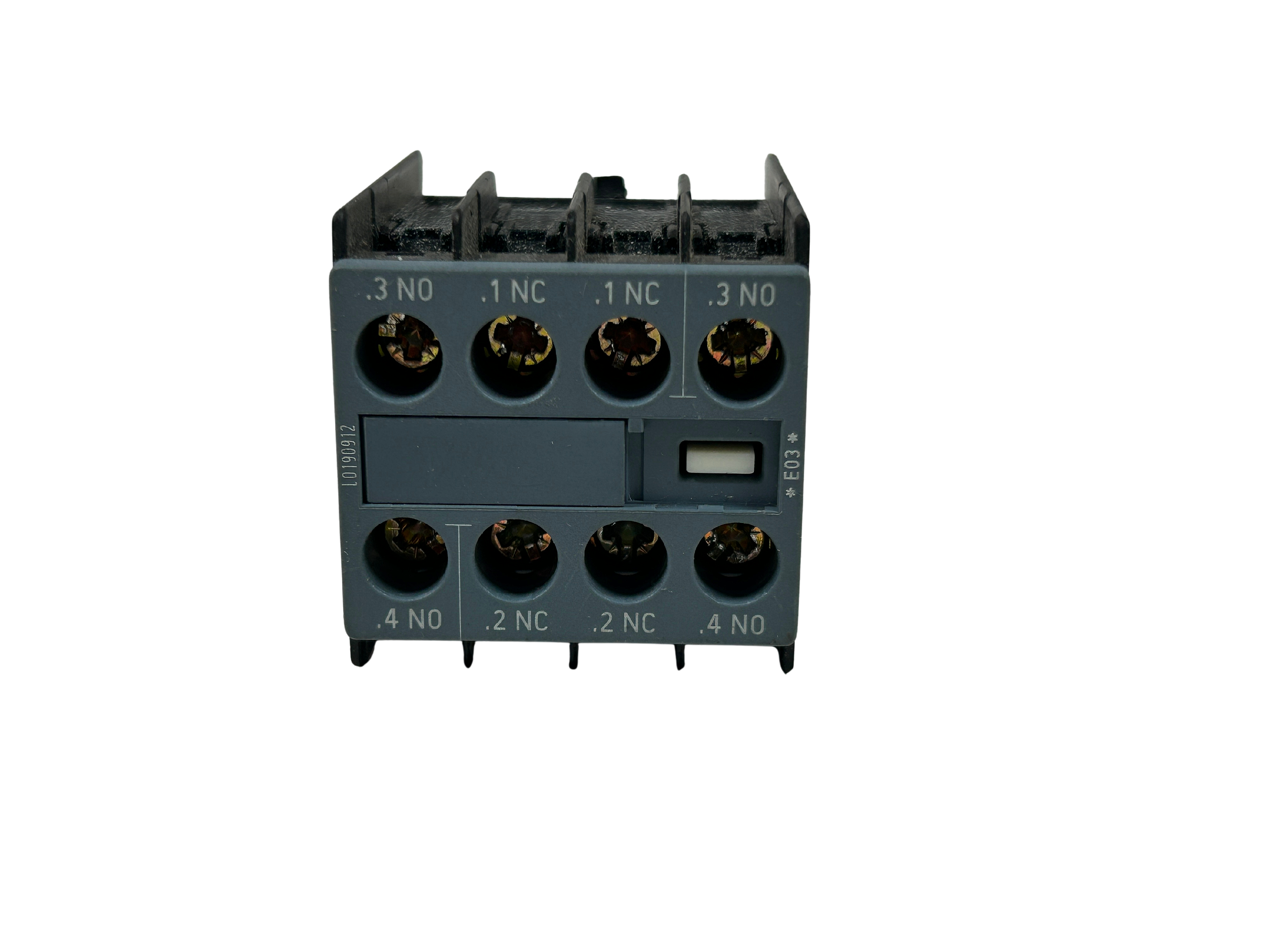 Chave auxiliar: na parte frontal, 2 NA + 2 NF, .3/.4, .1/.2, .1/.2, .3/.4, circuito de corrente: 1 NA, 1 NF, 1 NF, 1 NA, terminal de parafuso, para contatores 3RT2 e relés de contatores 3RH2.