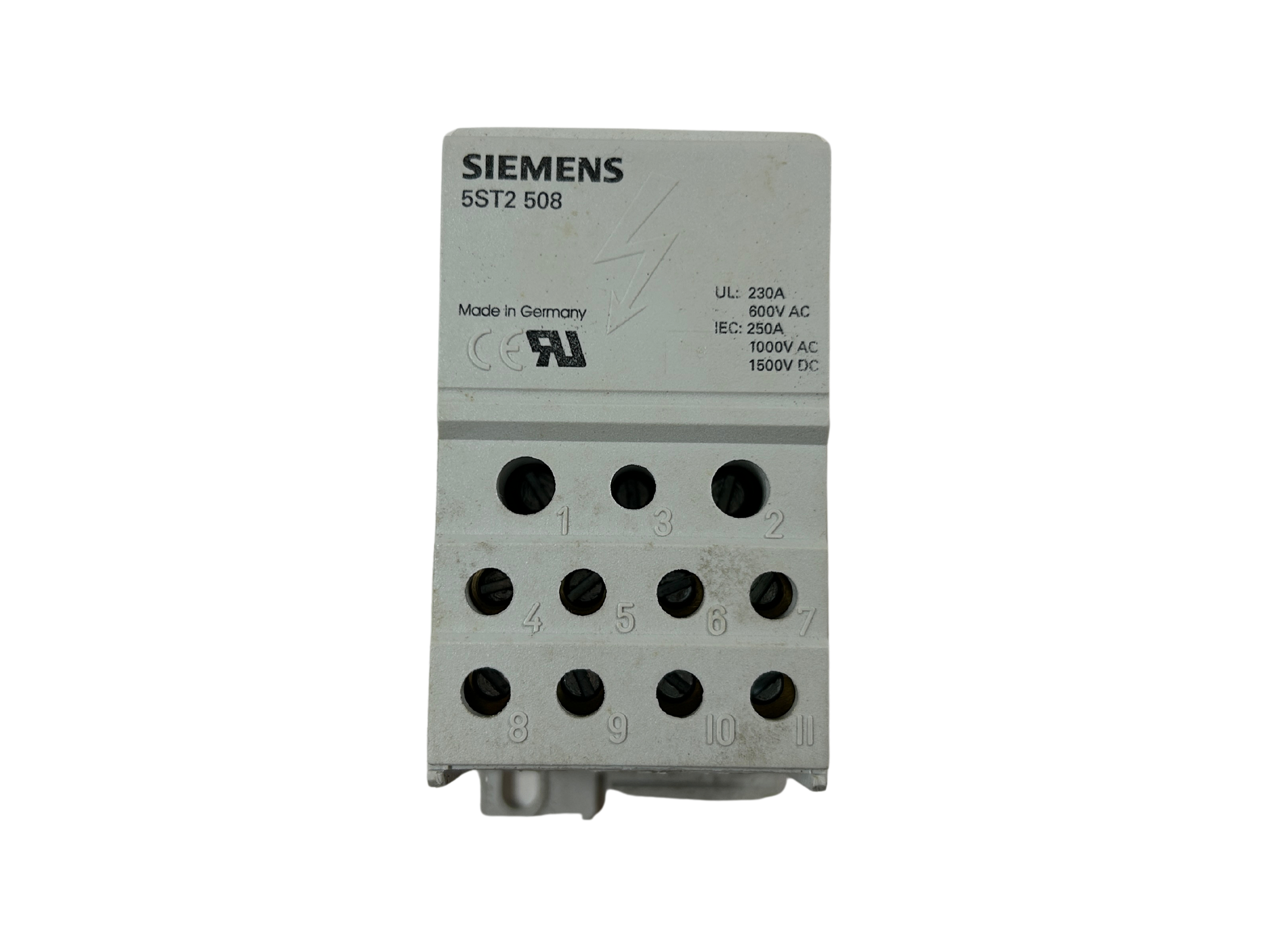 Bloco de distribuição monopolar, IEC 250 A, 1000 V CA / 1500 V CC; UL 230 A, 600 V CA/CC; entrada: 1x 35-120 mm², saída: 2x 2,5-35 mm², 5x 2,5-16 mm², 4x 2,5-10 mm² para montagem em trilho DIN 5ST2508 Siemens.
