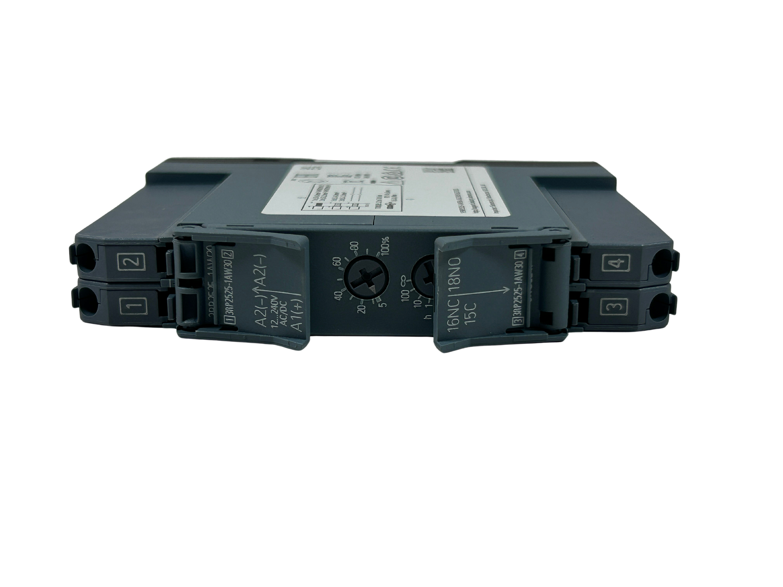 Relé de temporização eletrônico com retardo na condução, 1 contato reversível, 7 faixas de tempo de 0,05 s a 100 h, 12-240 V CA/CC a 50/60 Hz CA com LED, terminal de parafuso.